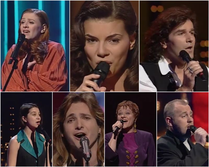(clockwise from top-left: Russia's Youddiph, Poland's Edyta Górniak, Romania's Dan Bittman, Lithuania's Ovidijus Vyšniauskas, Estonia's Silvia Vrait, Slovakia's Tublatanka, and Hungary's Friderika)